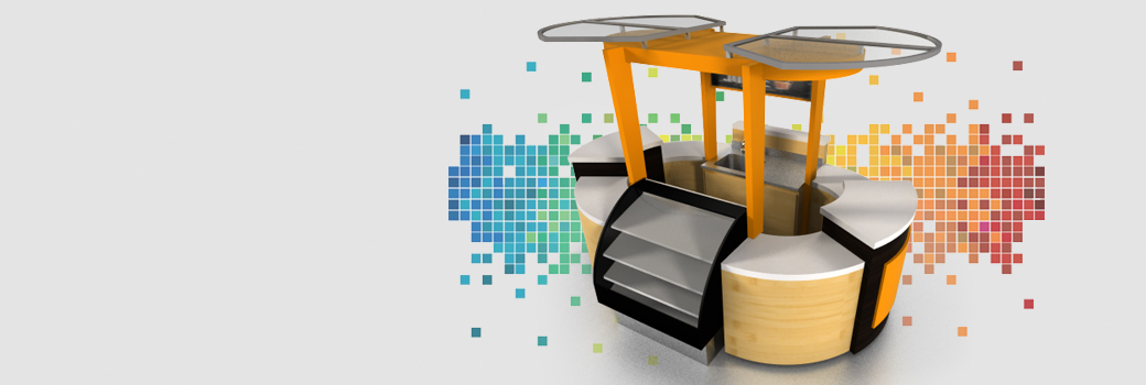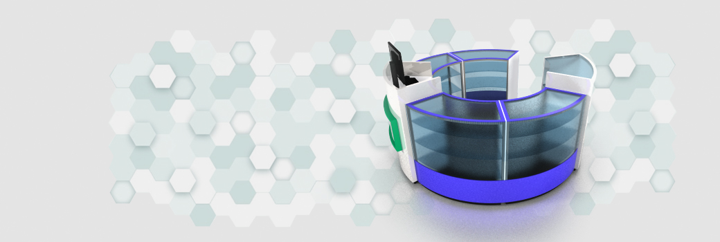 Puntos de pago y counters incorporando exhibición de producto, imagen corporativa y atención a clientes.